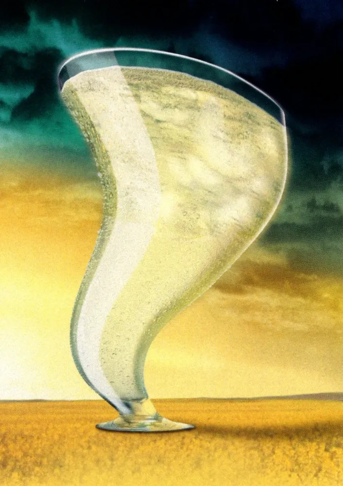 And the tilted champagne glass bends the rules of perspective, caught mid-twist between celebration and dream. It feels surreal and cinematic, like joy stretched just far enough to become art.