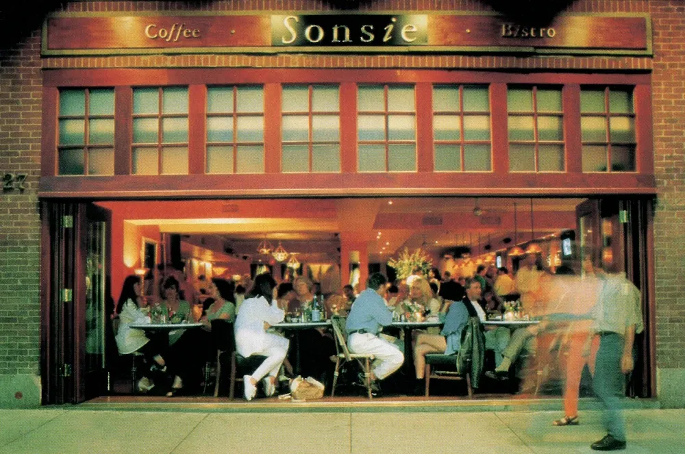 The Sonsie Café card glows with the warmth of city evenings — people gathered, conversations spilling out onto the sidewalk. It captures that familiar rhythm of motion and pause, where sound, laughter, and streetlight meet.