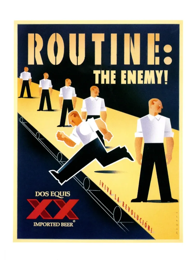 The Dos Equis “Routine: The Enemy!” card is bold and defiant, an anthem for every creative who refuses to settle. Its clean lines and mid-century confidence turn rebellion into design.
