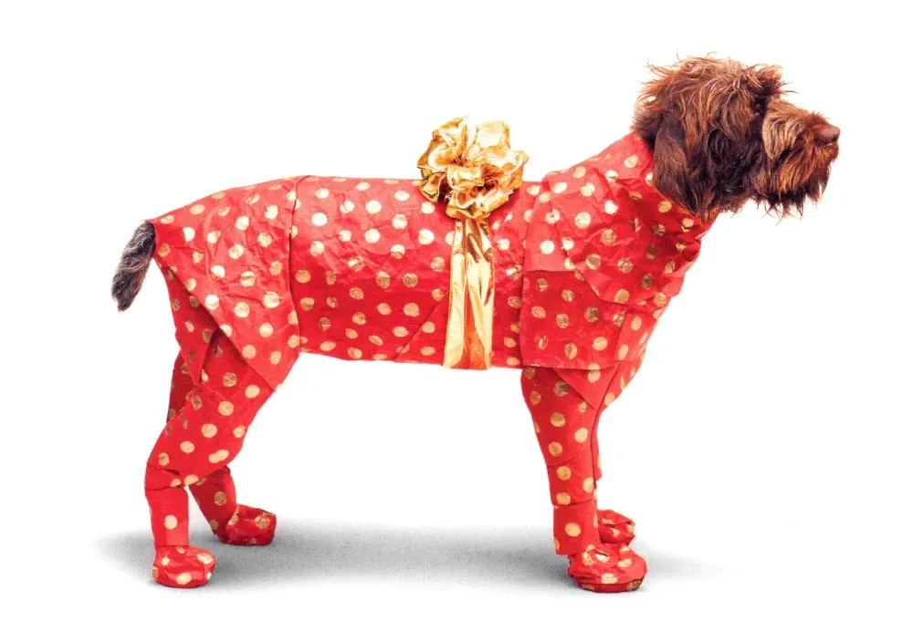 And the wrapped dog — red paper, gold ribbon, and patient eyes — is both absurd and sweet. It makes you smile, then think, reminding us that love often comes dressed in laughter.