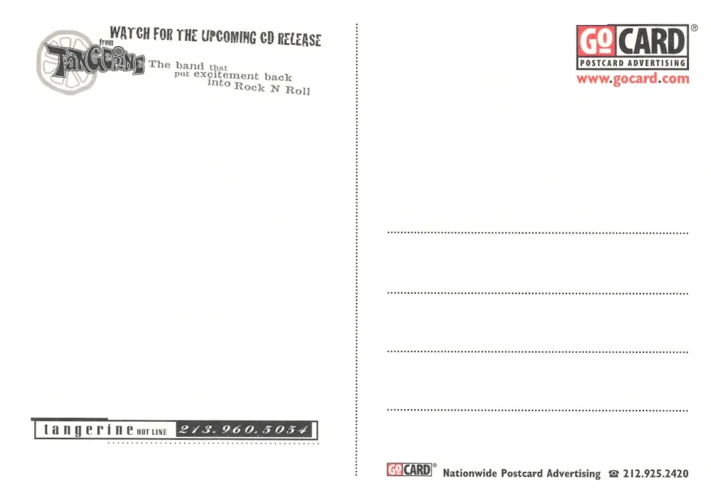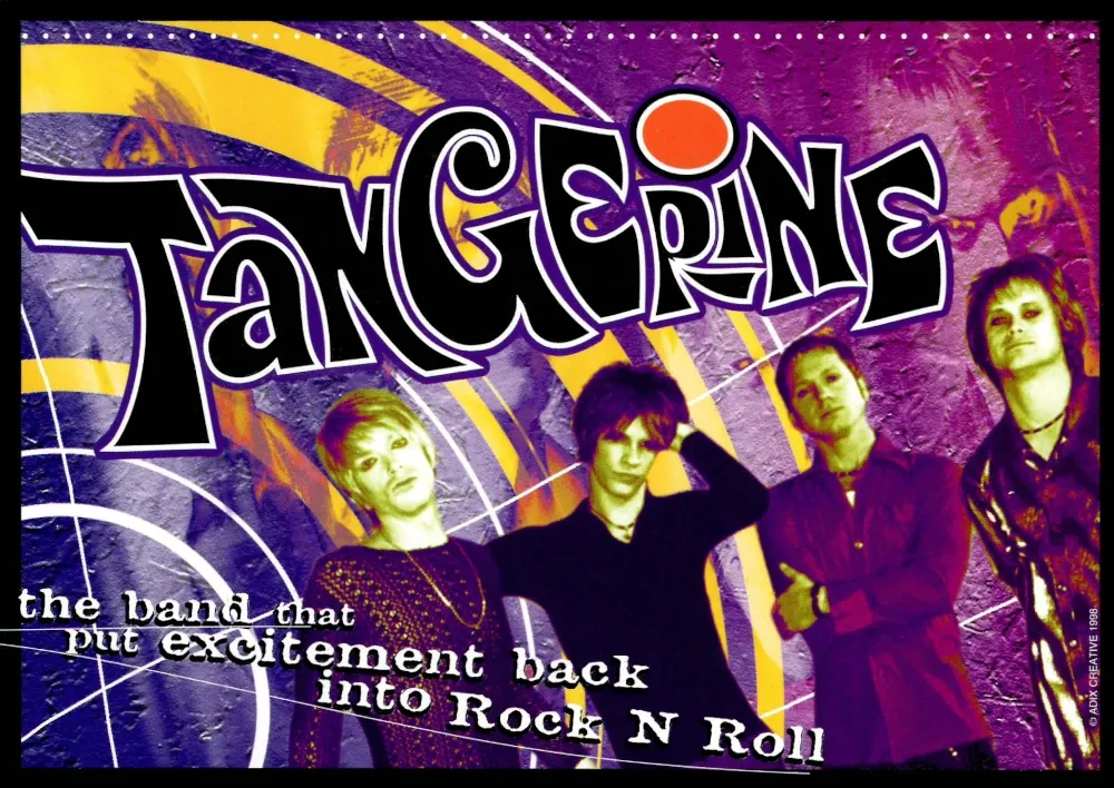 The Tangerine postcard bursts with color and swagger, its promise loud and unapologetic — “the band that put excitement back into rock ’n’ roll.” It feels like the late nineties distilled: bold typography, confidence without irony, and that familiar hunger to make something that still mattered.