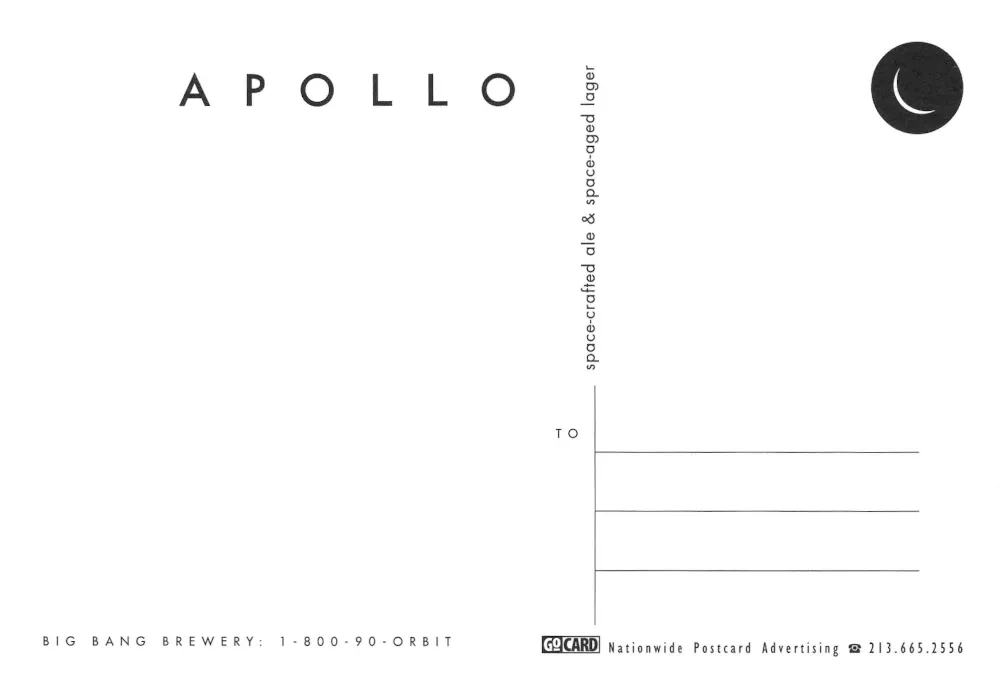 Then comes the Apollo Beer postcard, minimalist and space-age sleek — “The beer that fell to earth.” It feels like a wink to the future, a reminder that even the most commercial designs once dreamed of orbit.