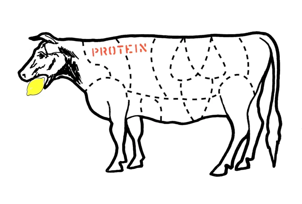 This card features a line illustration of a cow with dashed butchery style lines across the body. A band's name: "Protein" appears in stenciled lettering along the upper torso. A lemon is positioned in the animal’s mouth, creating a contrast between the livestock diagram and the unexpected fruit element. This type of illustration was often used in the late 1990s to create bold, simplified imagery for album or band promotion.