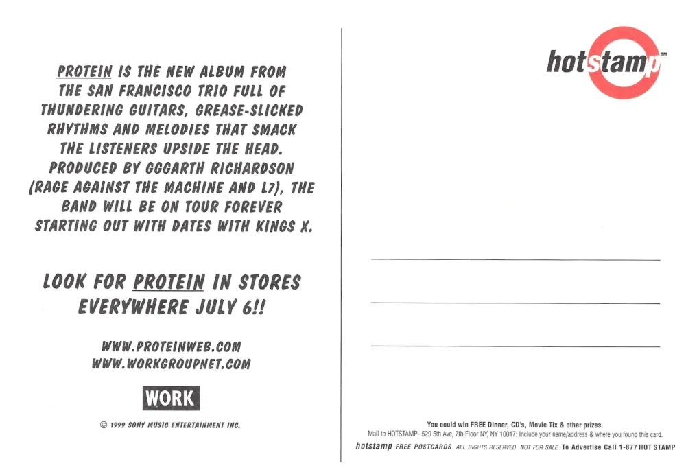 Protein, a San Francisco based rock trio active during the late 1990s. The description references producer Garth Richardson and highlights the band’s touring activity, including dates with Kings X. The card was distributed by the label Work Group under Sony Music Entertainment. Promotional postcards of this kind were common in retail outlets, clubs, and record stores at the time.