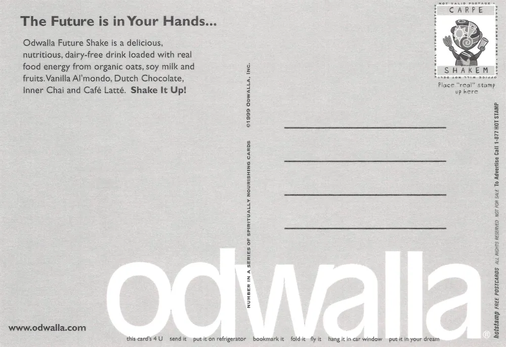 The card advertises Odwalla Future Shake, a dairy free beverage line made with oats, soy milk, and fruit. Listed flavors include Vanilla Al mondo, Dutch Chocolate, Inner Chai, and Café Latte. The stamp area contains a printed illustration labeled Carpe Shakem. The card identifies itself as number one in a series of spiritually nourishing cards, a marketing approach Odwalla used during this period.