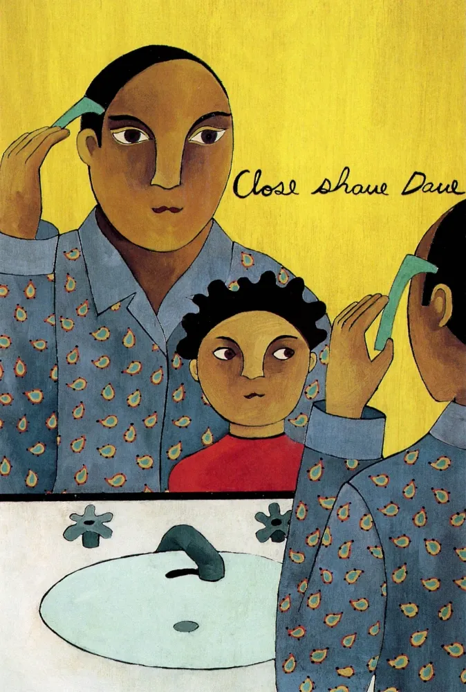 This card presents an illustration depicting a person shaving while looking into a mirror, with a child visible in the reflection. The scene is rendered in a flat, stylized manner using muted colors and patterned clothing. The title Close Shave Dave appears in handwritten script. Artwork of this type was common in independent bookstores and art card series of the 1990s, often featuring everyday domestic scenes interpreted through contemporary illustration.