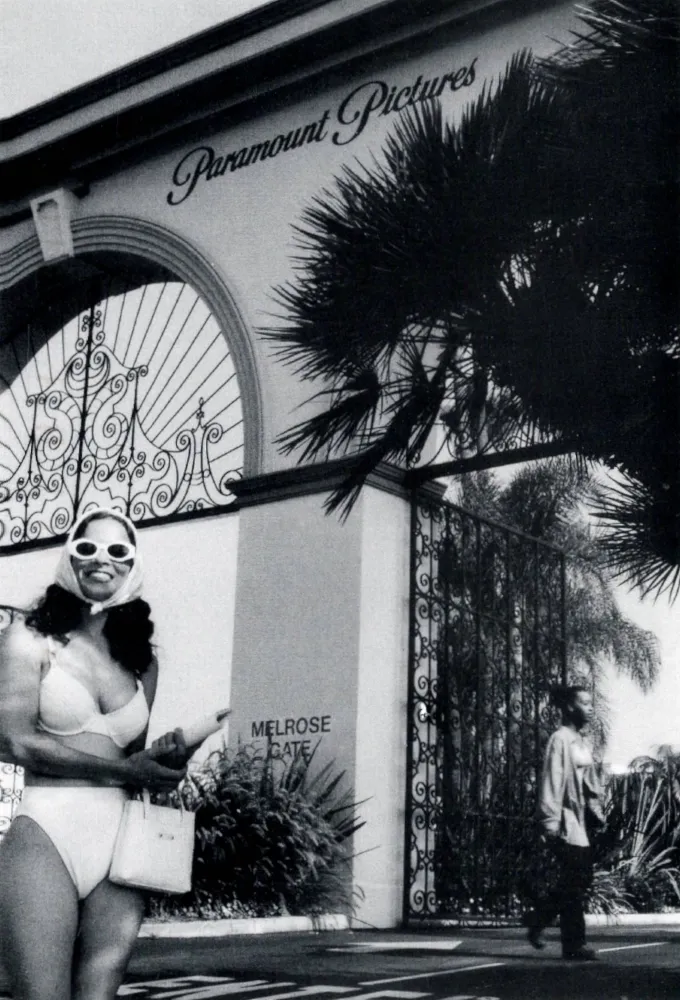This black and white photograph shows the Melrose Gate entrance of Paramount Pictures in Los Angeles, with the signature ironwork arch and the Paramount Pictures sign above it. In the foreground, a person wearing a bathing suit, sunglasses, and a headscarf stands near the curb while another individual walks past the gate. This composition reflects candid street photography using a well known studio gateway as context.