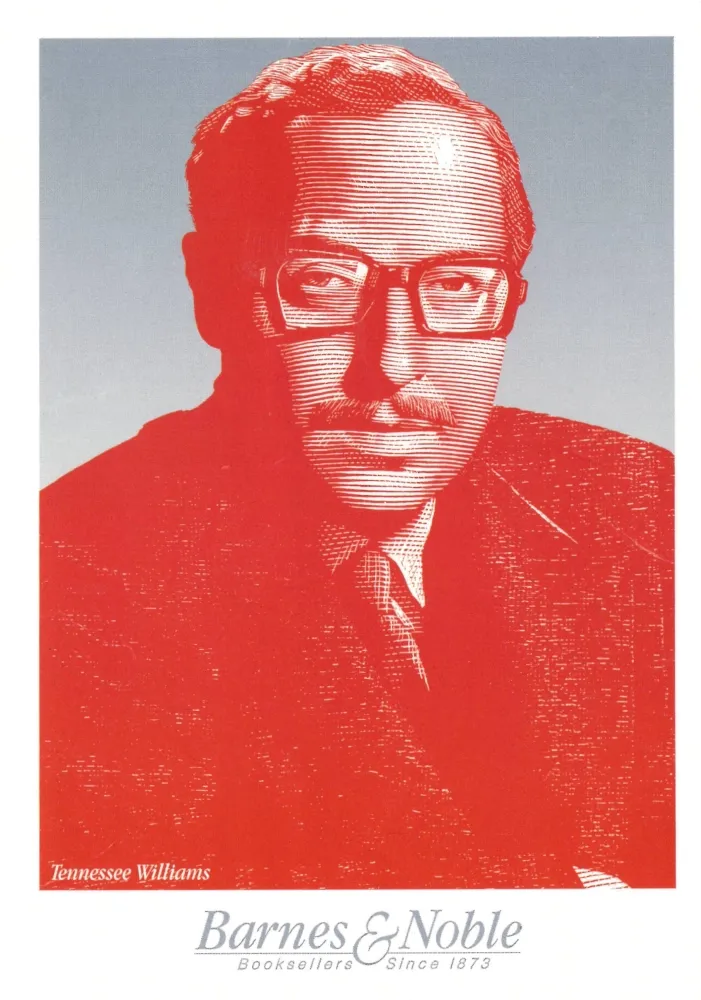 This card features a stylized portrait of the writer Tennessee Williams rendered in red and white line work against a gradient background. The Barnes and Noble logo appears at the bottom, and was part of a promotional series highlighting notable literary figures. Retailers often produced author themed postcards during the 1990s for in store display and customer pickup.