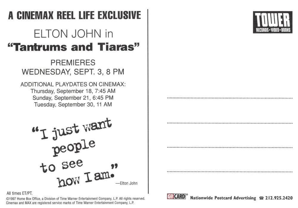The reverse lists premiere and replay dates on Cinemax. A quotation attributed to Elton John appears below the schedule. Branding for Tower Records is shown on the right side. Cards of this type were commonly distributed in record stores and entertainment venues to promote televised documentary releases.