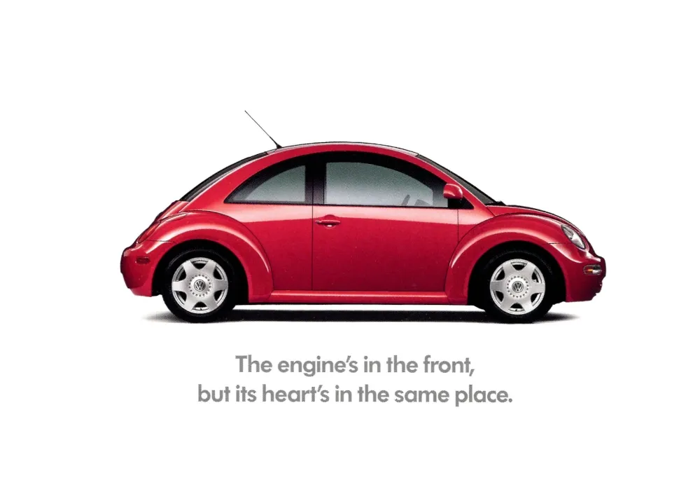 This card displays a side profile photograph of the new Volkswagen Beetle. The engine’s in the front, but its heart’s in the same place. The New Beetle, introduced in 1997, incorporated design elements recalling the original Volkswagen Beetle while using a modernized chassis layout. This postcard reflects the brand’s emphasis on nostalgia linked to updated engineering.