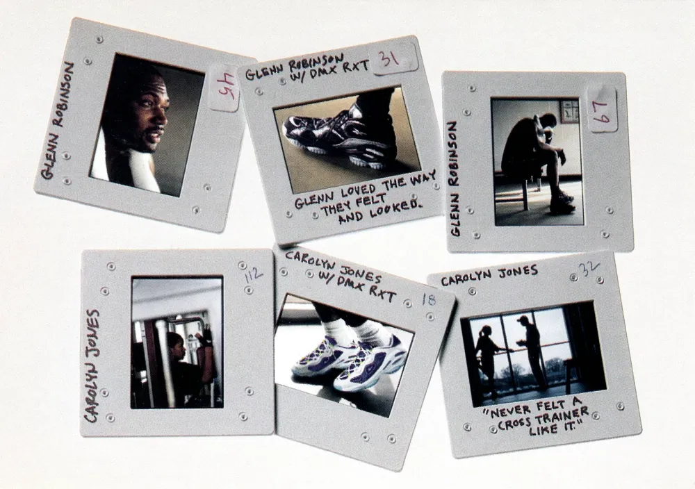 This card reproduces a set of photographic slides for a sneaker advertisement. The slides show athletes and athletic footwear, with handwritten labels referencing Glenn Robinson and Carolyn Jones along with the D Max RXT shoe model. The imagery combines product photography with lifestyle imagery typical of late 1990s athletic marketing. The handwritten notes imitate a design, or advertising proof sheet.