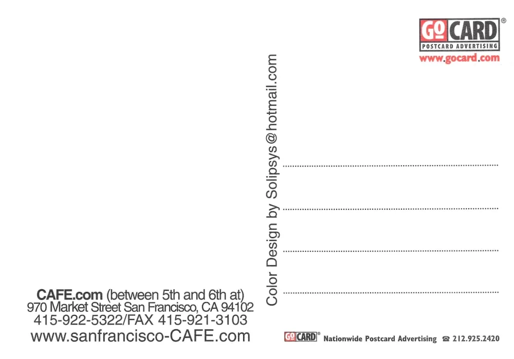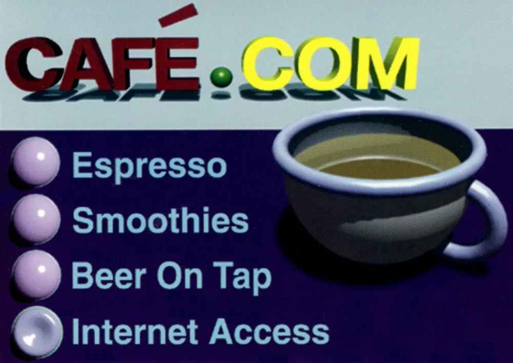 This card advertises Café Dot Com, using early internet era typography and design elements. This graphic features a stylized coffee cup along with a list of offerings including espresso, smoothies, beer on tap, and internet access. Establishments of this type were very popular in the late 1990s, and a trend in internet cafes that combined beverage service with dial-up public computer access.