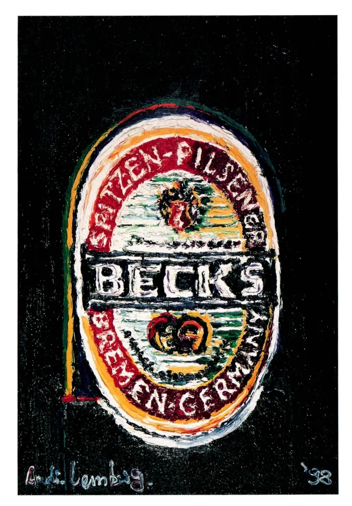 This card reproduces a painted interpretation of the Beck’s beer label, a German pilsner produced in Bremen. This artwork style uses thick brush strokes and a textured surface to re create the label’s recognizable oval shape and color scheme. The painter’s signature and date 98 appear at the bottom. Painted renderings of commercial logos were a popular motif during the late 1990s.