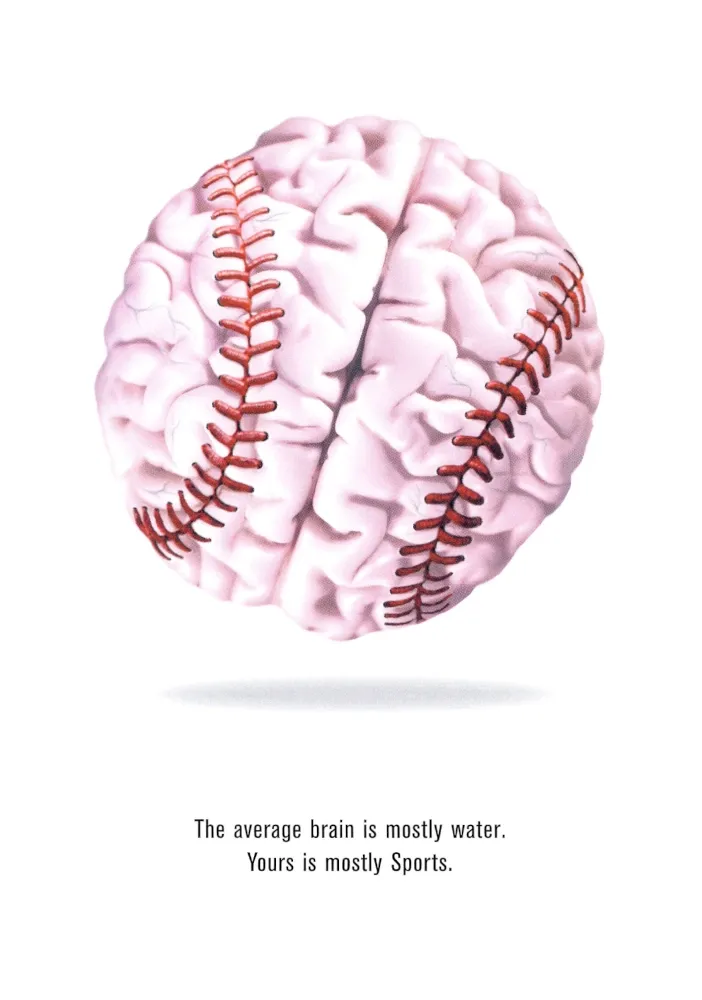 This card displays an illustration of a human brain modified with baseball style stitching. The caption: "The average brain is mostly water. Yours is mostly Sports." This type of artwork was characteristic for sports themed advertising in the late 1990s, using anatomical graphics combined with humor to draw attention.