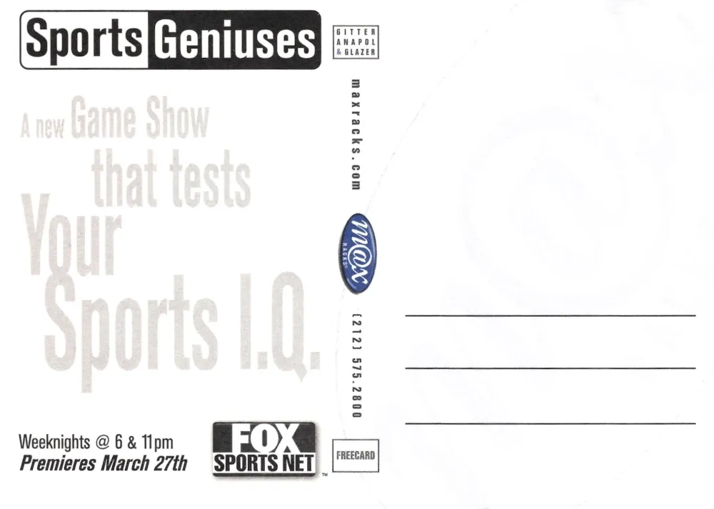 The reverse promotes Sports Geniuses, a game show aired on Fox Sports Net. The program’s show focused on testing sports knowledge and provided popular sporting events.