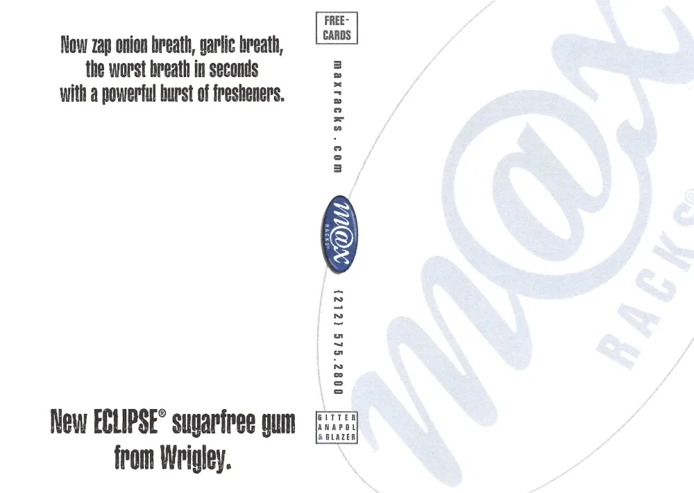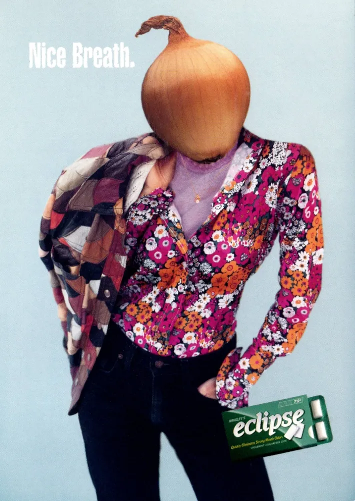 This card's photograph is of a person whose head has been replaced an onion, nice. The subject is dressed in 90's clothing against a plain background, again typical in the 90's. The phrase: "Nice Breath" also shows in the upper left corner. This postcard promotes Eclipse gum by Wrigley, using artistic humor.