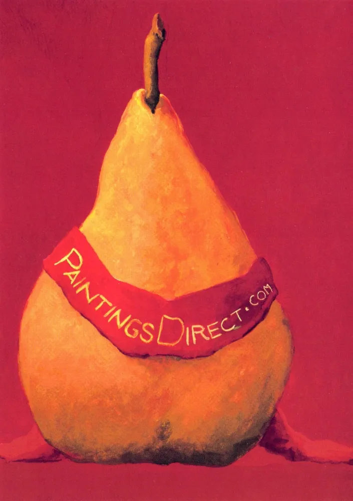 This postcard, with a large pear wearing a sash with PaintingsDirect.com wrapped around the fruit. The image appears as a logo for the online art retailer PaintingsDirect. The style is a contemporary painting with simple shapes and saturated color.