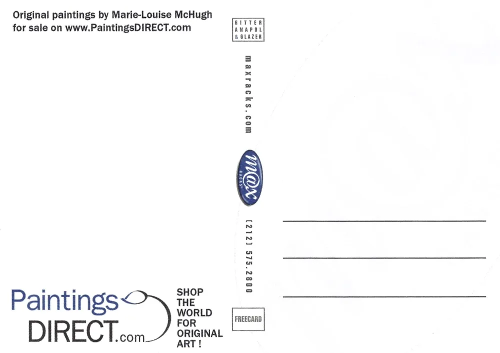 The reverse promotes original paintings by Marie Louise McHugh available for purchase through the PaintingsDirect website. The card references the shift in the late 1990s toward online platforms offering direct sales of artwork. The website still shows registered and active but the website appears to not be active.