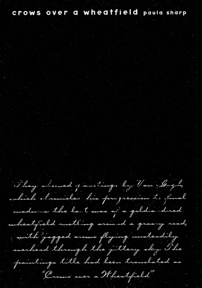 This card features black background artwork accompanied by handwritten script referencing Vincent van Gogh’s painting Crows Over a Wheatfield. This describes the painting as part of a series that documented van Gogh’s final creative period. The layout appears to emphasize a reflective nature of the passage.