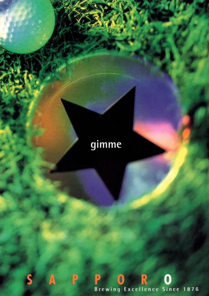 This card displays a close up photograph of a golf ball resting on grass near a star shaped metal marker engraved with the word gimme. This postcard promotes Sapporo beer branding at the bottom, referencing the brewery’s founding year of 1876.