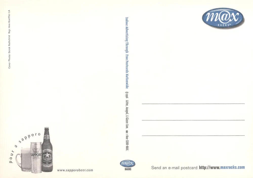 As I move deeper into this collection, the postcards begin to form their own quiet record of the places, products, and ideas that surrounded life on the road in the 1990s. Earlier entries in this series captured the bright energy of clubs, art venues, and touring culture. This new group reveals a broader landscape, where advertising, illustration, and entertainment each played a role in shaping the visual environment of the decade. What stands out now is how varied the sources were. A single week on tour can bring postcards from restaurants, breweries, bookstores, cosmetics companies, credit card campaigns, and film studios. Each card had a practical purpose, yet taken together they show how design trends and cultural priorities expressed themselves in everyday materials.