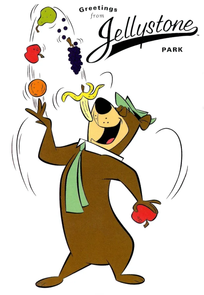 This is my favorite postcard in this series. The postcard features the animated character Yogi Bear juggling various fruits, with the caption Greetings from Jellystone Park. The character design follows the traditional Hanna Barbera style with clean outlines and flat color fields. Jellystone Park is the fictional campground setting where Yogi Bear lives.