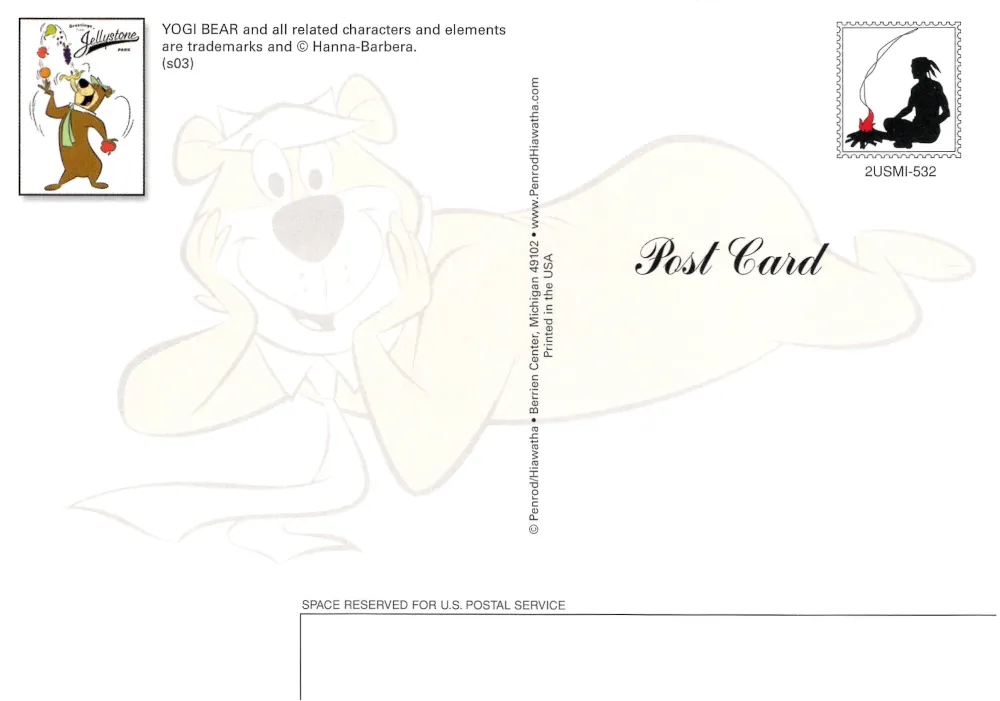 The reverse includes the ownership and trademark notices for Yogi Bear and their related characters. A faint background image of Yogi Bear is shown behind the writing area. The card was produced by Penrod Hiawatha, a publisher known for licensed cartoon postcards.