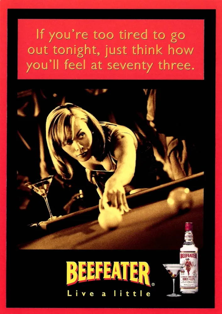 This postcard shows a nightclub scene with a woman learning how to play pool, reaching toward a cue ball. The photograph has nice sepia tones. The phrase: "If you’re too tired to go out tonight, just think how you’ll feel at seventy three". Beefeater branding is at the bottom along with the tagline: "Live a little". This postcard reflects 1990s advertising trends that associated spirits with nightlife environments, which is still common to this day.
