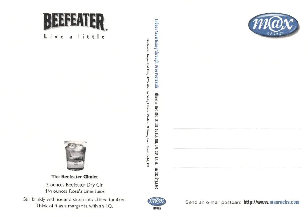 The reverse features a nice recipe for the Beefeater Gimlet cocktail, listing proportions of Beefeater Dry Gin and Rose’s Lime Juice. The layout includes Max Racks distribution markings and standard postcard addressing lines.