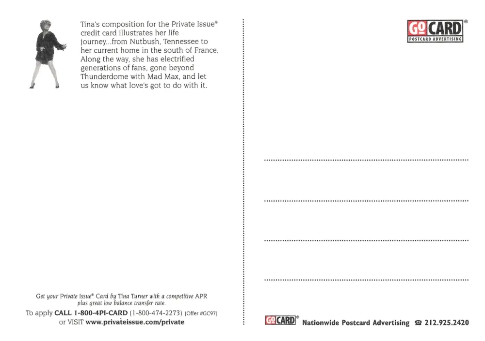 The reverse explains that the illustration represents Tina Turner’s life journey, from Nutbush to her residence in the south of France. It mentions her cultural impact as a performer and references her role in Max Max Beyond Thunderdome. The card also includes application information for the Private Issue credit card and GoCard advertising.
